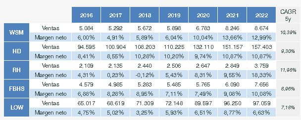 En este apartado he colocado algunas empresas como Home Depot (HD) y Lowe’s (LOW), que son monstruos al lado de WSM, pero lo cierto es que su negocio no es exactamente el mismo.