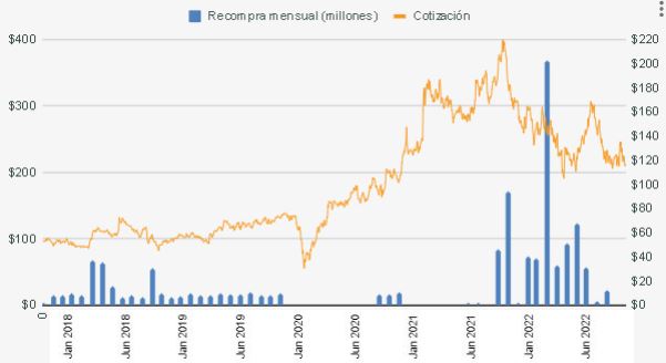 La recompra es muy escalonada, y en muchas de las caídas el dinero destinado supera con creces a cuando la cotización aumenta. La directiva ha repartido el 96% del beneficio neto a los accionistas entre una cosa y la otra, desde 2013.