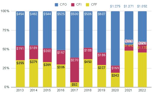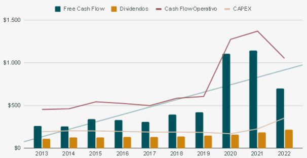 Me parece relevante este gráfico para ver hasta que punto genera efectivo. Dejando de lado que no hay años raros, dado que apenas crecen por adquisición ni emiten deuda, solamente con el CFO -casi- cubren un todas las inversiones y operaciones financieras de cada año. Esto es raro de cojones. No se complican la vida y esto es muy significativo de cara al accionista.