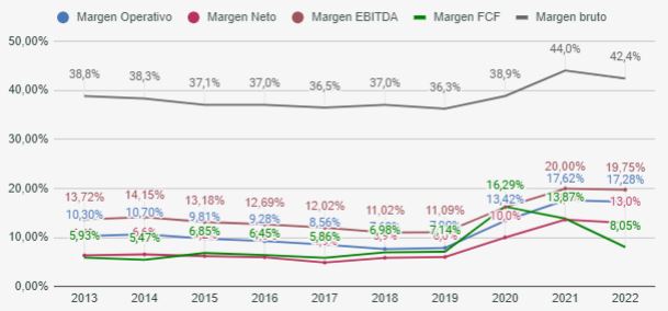 Los márgenes de la compañía también son positivos y estos últimos 3 años han aumentado significativamente. El neto se sitúa al 13% aunque hasta 2019 un 6,2% había sido el más elevado. Imagino que todo esto se debe a la gran cantidad de ingresos en línea y que no hay intereses de deuda.