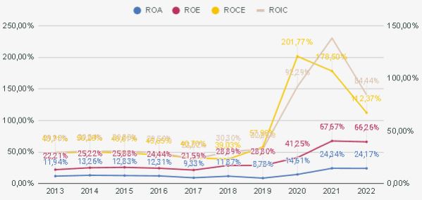 En cuanto los ratios de rentabilidad, son extraordinarios. Por enésima vez vemos que se catapultan desde 2020 con las ventas en línea y hasta el ROA es excelente, con un 24%. El pico del ROCE no hay que hacerle caso, eso sí, pero ajustado es fenomenal igual.