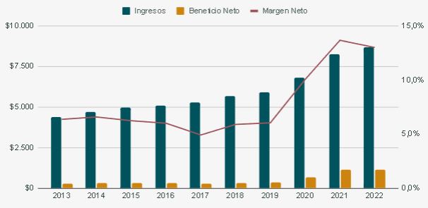 Esto también repercute al beneficio neto, y es que más ventas en línea disminuyen los costes de administración de manera significativa. Este aumenta un 15% anual, aunque en 2022 se ha mantenido plano. El beneficio por acción, por su lado, y debido a un, a mi parecer, buen sistema de recompra de acciones, aumenta prácticamente al 20%.